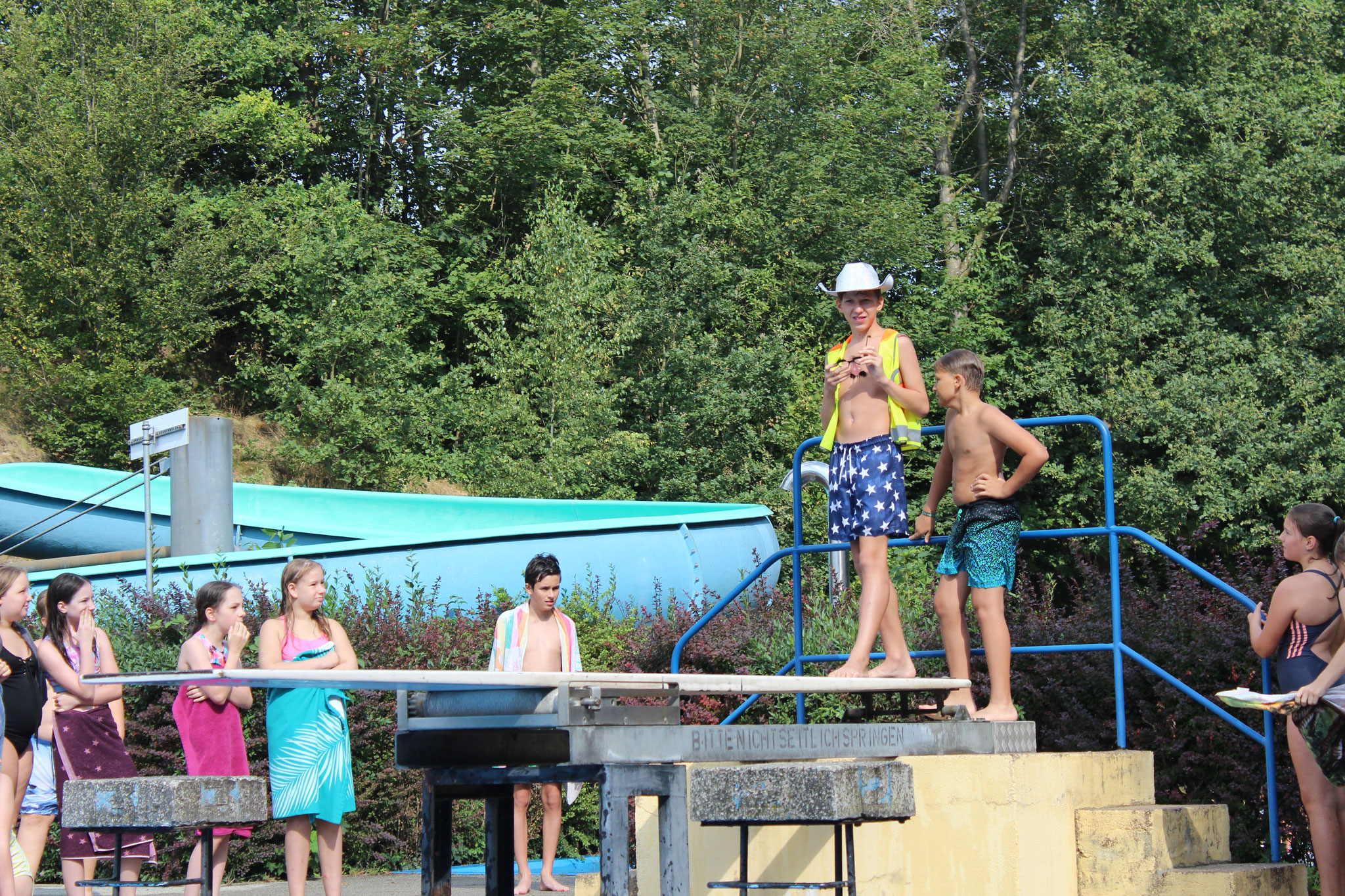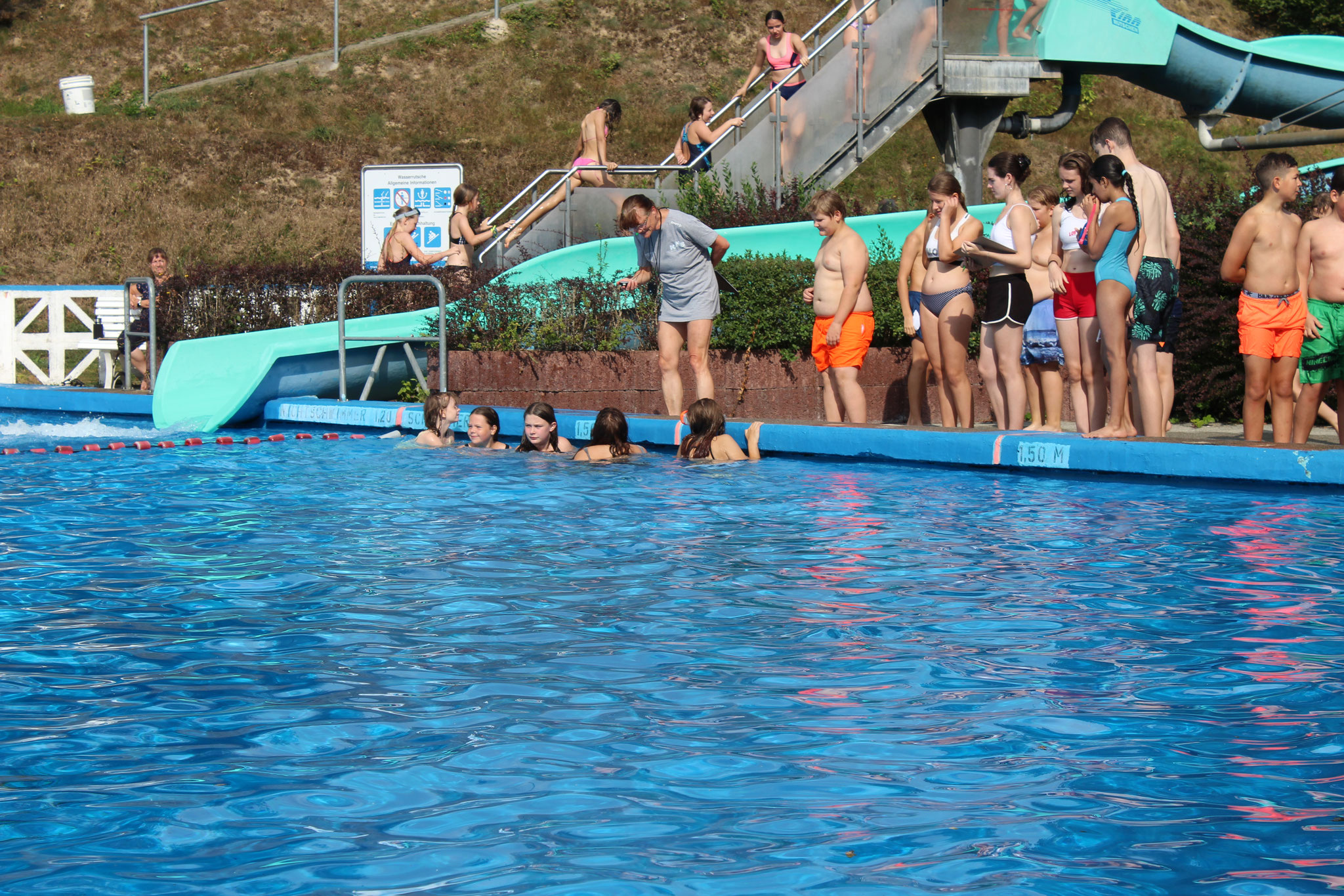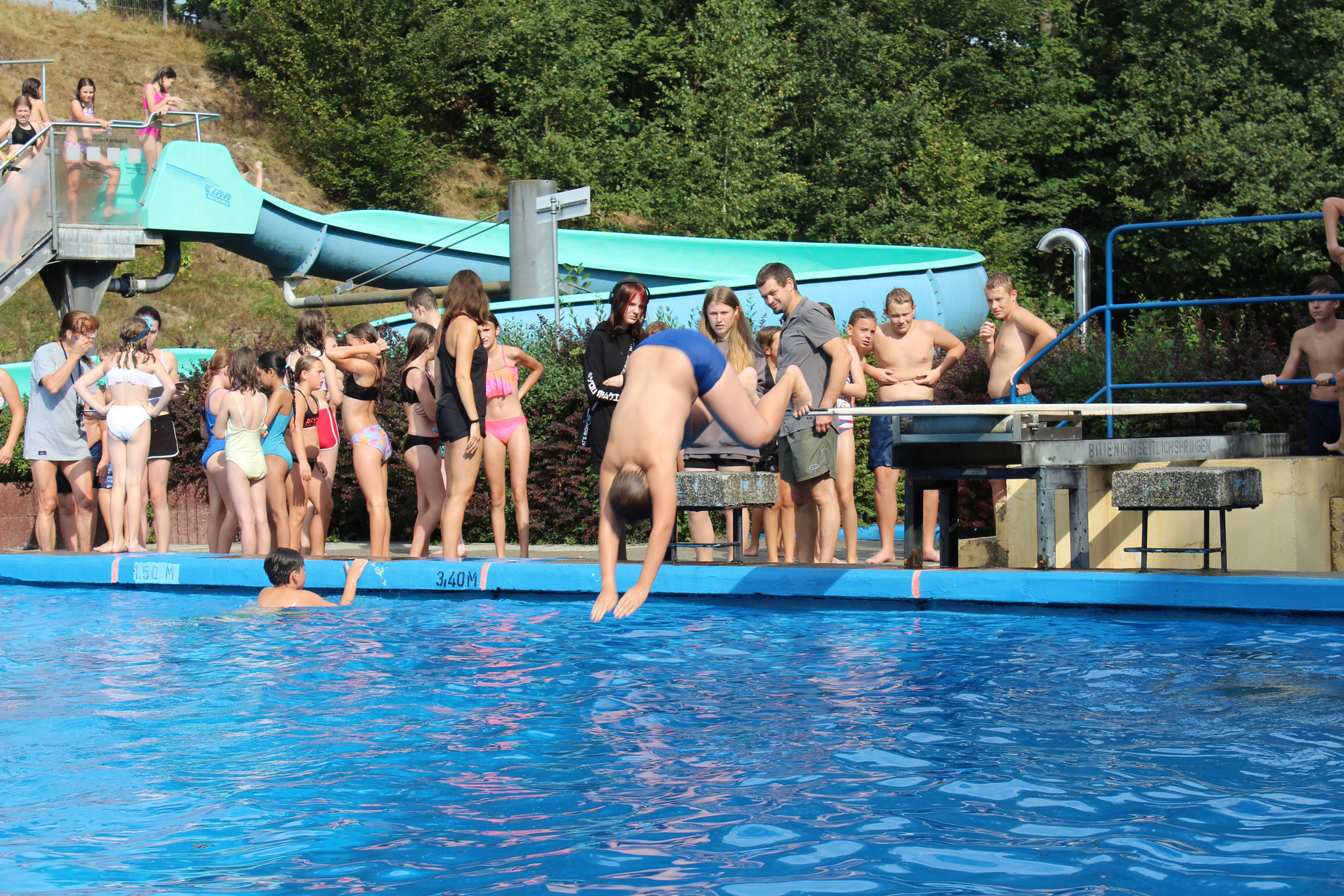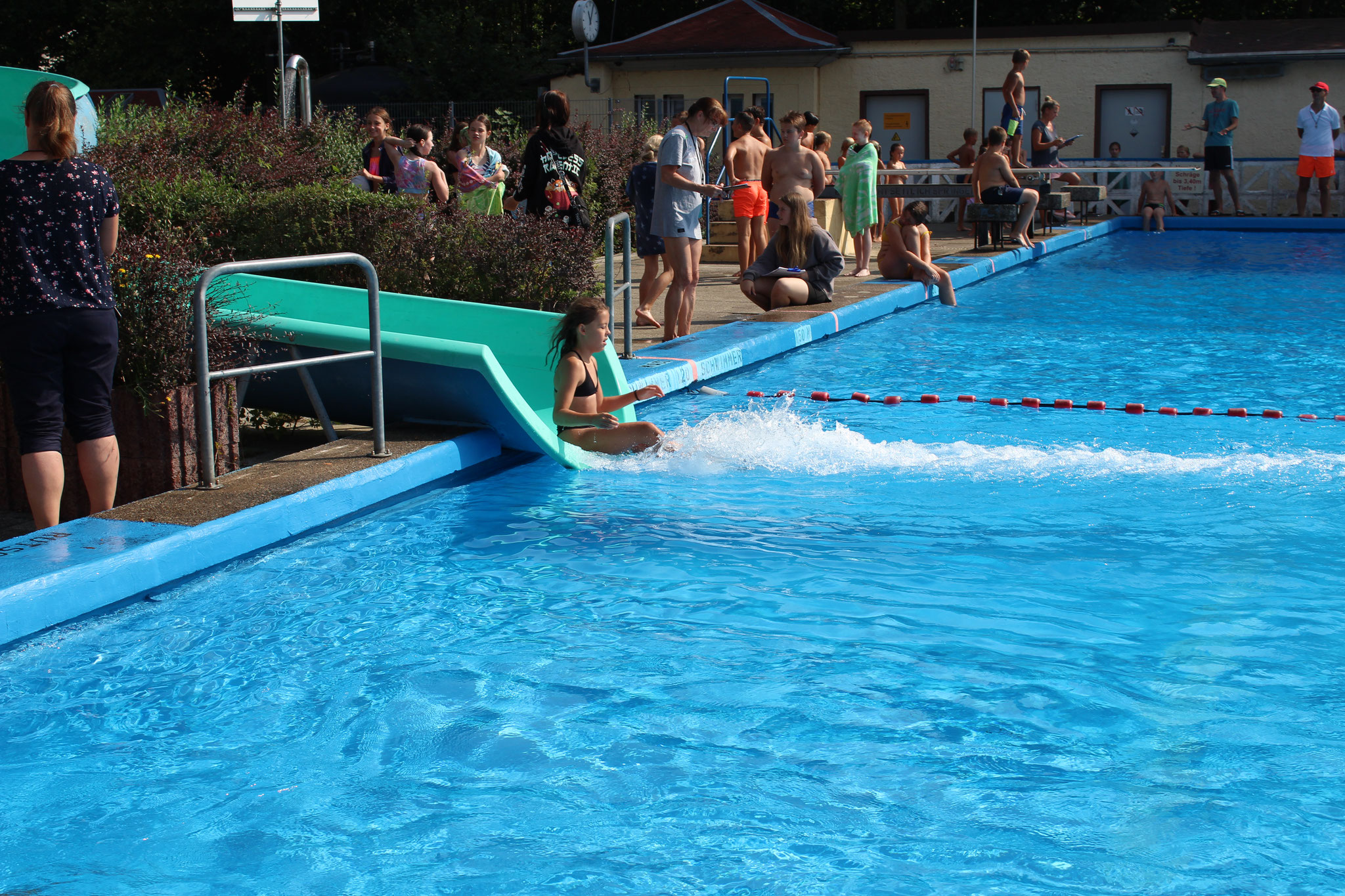 An den Schwimmstationen beeindruckten viele Schülerinnen und Schüler mit ihrem Können. Besonders stolz sind wir auf die zahlreichen Kinder, die erfolgreich die Schwimmstufe Bronze oder Silber erlangten. Auch beim Streckentauchen gab es nahezu rekordverdächtige Ergebnisse, die für Begeisterung sorgten. Das Wettrutschen und Kunstspringen brachten zusätzlich viel Freude für die Teilnehmenden selbst, als auch für die Zuschauer.