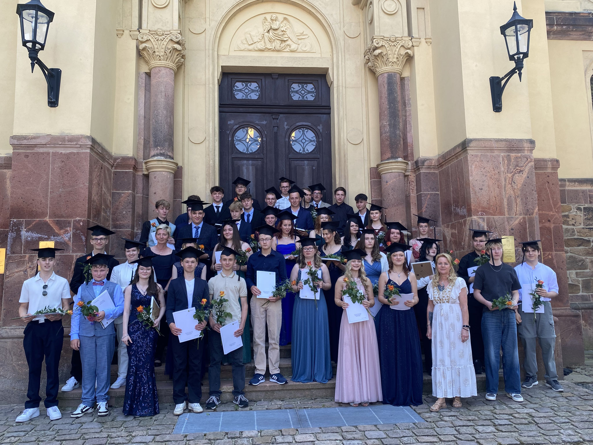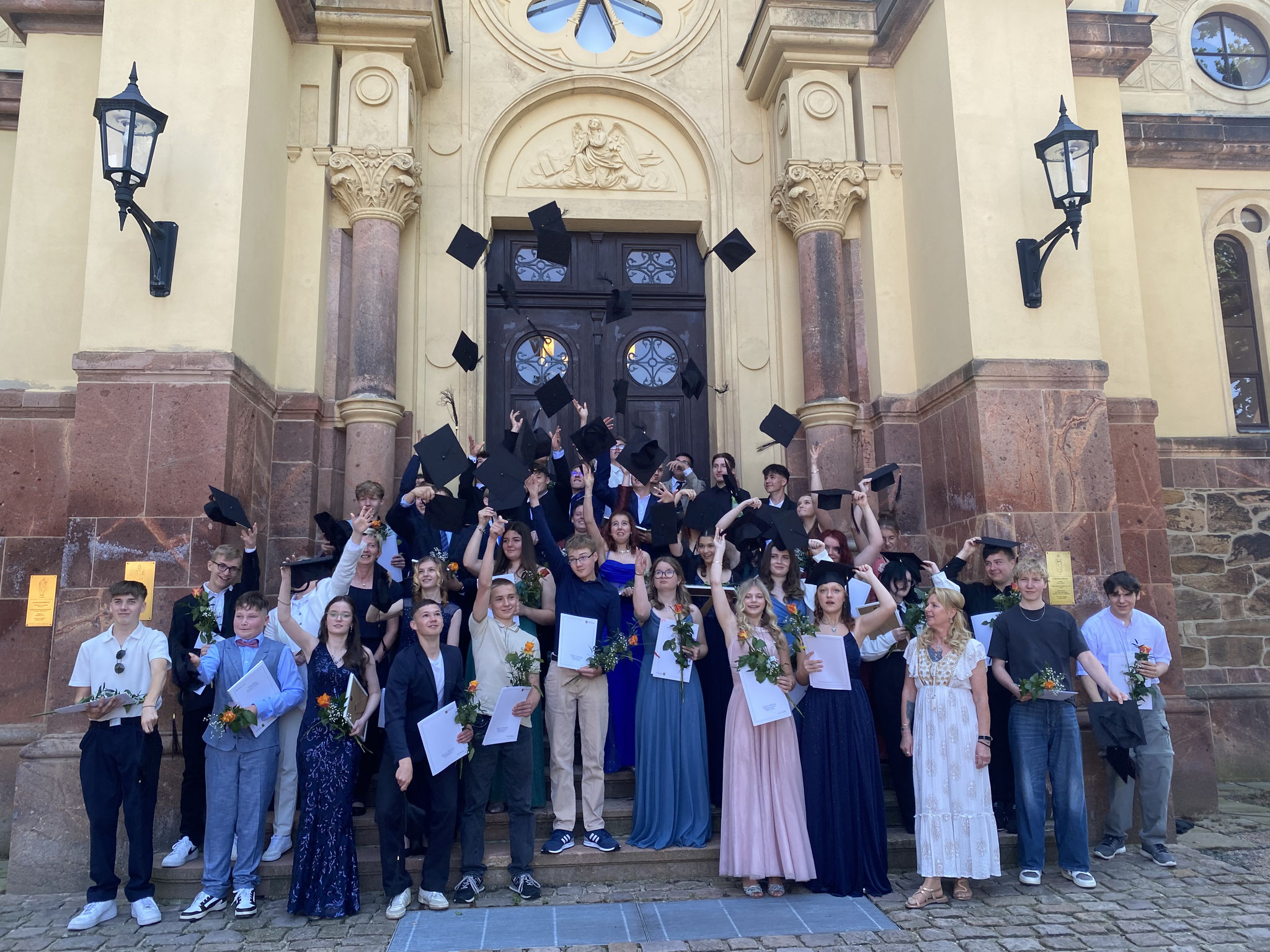 42 Abschlussschülerinnen und -schüler erhielten am 21.Juni 2025 in der Stadtkirche zu Hartha ihre Zeugnisse. Jahrgangsbeste ist Jenny (3-mal Note 2, ansonsten ausschließen Einsen); das entspricht einem Abschlussdurchschnitt von 1,15. Katharina folgt ihr dicht mit einem Durchschnitt von 1,35. der Jahrgangsdurchschnitt liegt bei 2,9.