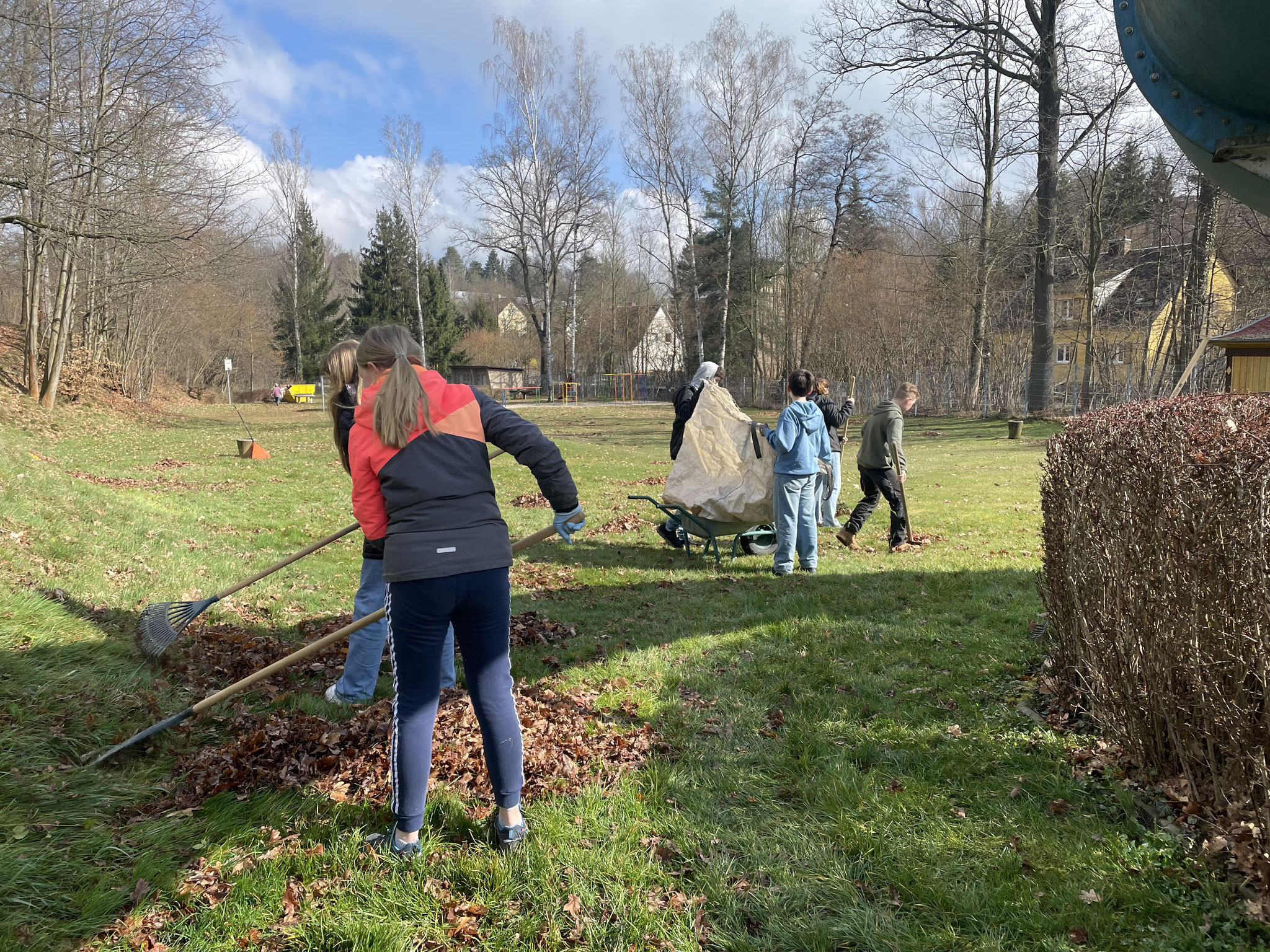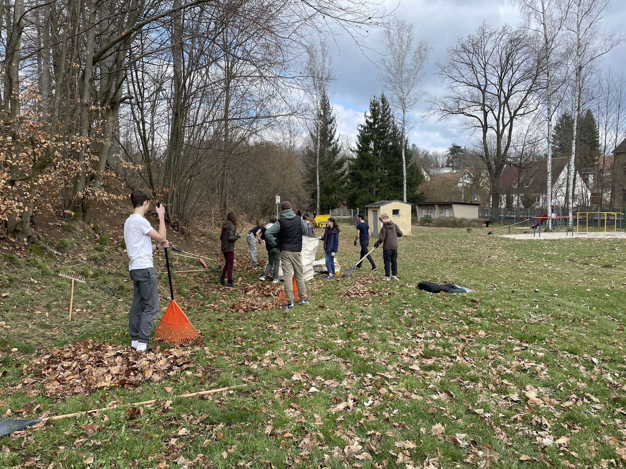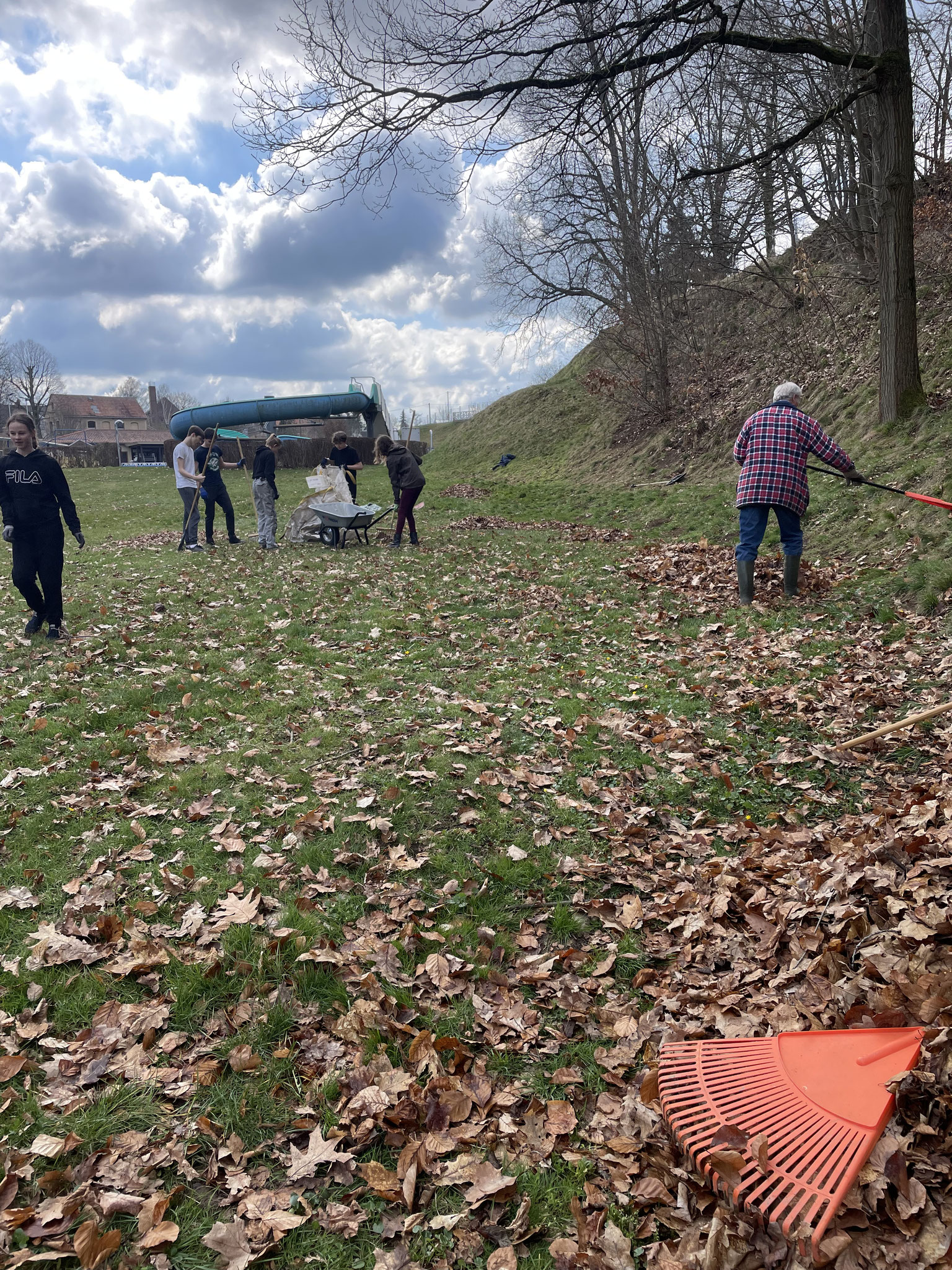 Bei angenehmem Frühlingswetter wurden auf den Hängen und der Liegewiese große Mengen Laub entfernt und zusammengeharkt.