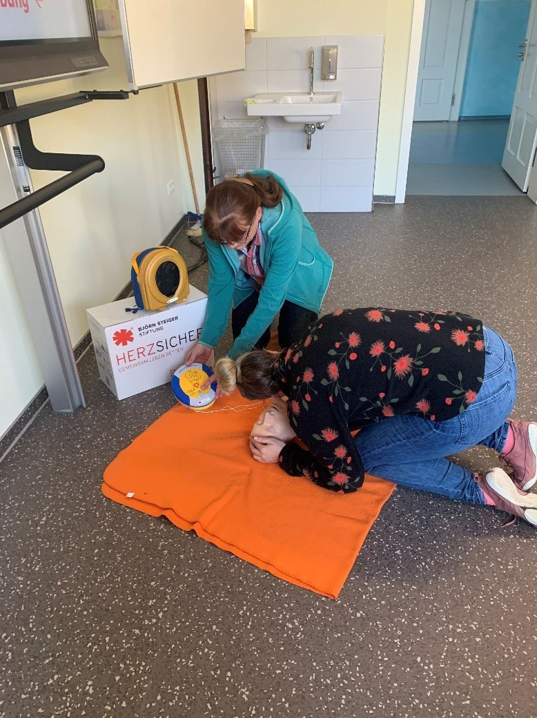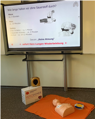 Entstanden ist diese Weiterbildung durch die Bewerbung unserer Schule an die Björn-Steiger-Stiftung für die Aktion „Herzsichere Schule“. Von der Stiftung kam dann nicht nur der Ausbilder, sondern unsere Schule erhielt auch einen Trainings-AED, einen Notfall-AED, sowie 12 Trainingspuppen für Wiederbelebung.