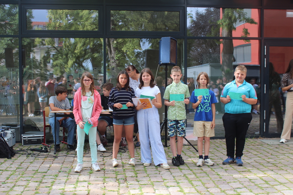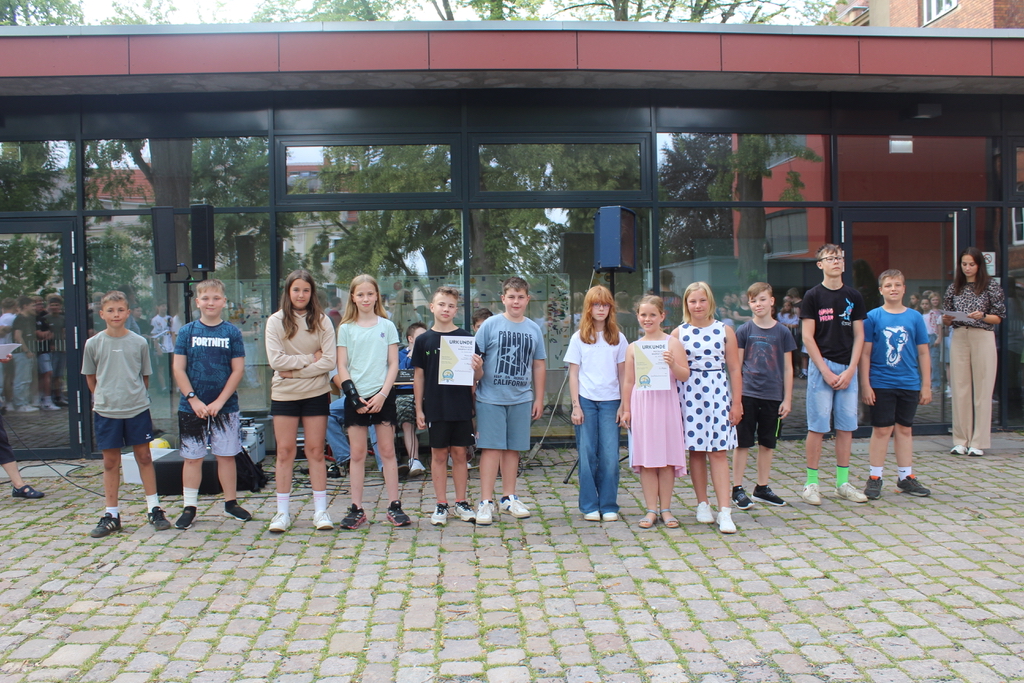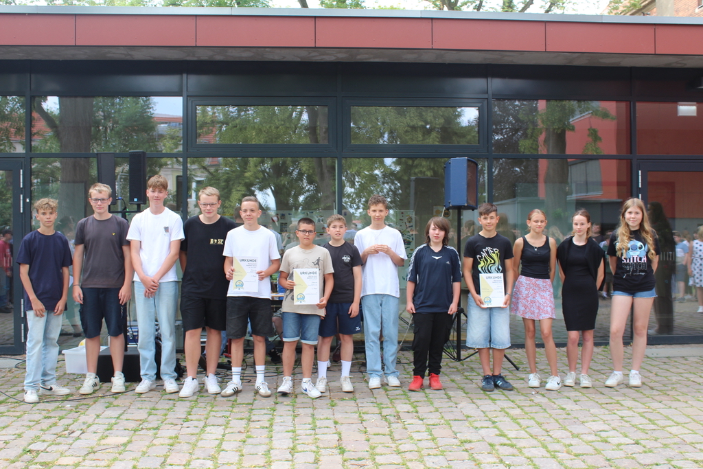 Das Team der Oberschule, die Klassenleitungen (Frau S. Berger, Frau Neumann, Fr. A. Berger und Herr Reinke), Herr Dr. Fichtner als Vertreter der Stadt und Frau Lang als Vertreterin des FöV gratulierten allen Schülerinnen und Schülern zu ihren Abschlüssen. Vom Förderverein der Oberschule wurden folgende Schülerinnen und Schüler ausgezeichnet: Chayenne, Jonas, Lukas, Johann Nathanael, Leony, Lucy, Nina, Leon, Mia, Paul, Jenny, Katharina, Till und Lene.